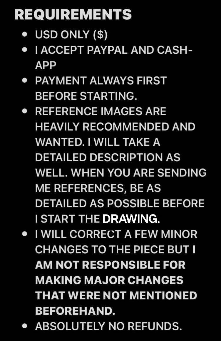 If you're here, you're most likely looking to commission; or interested in seeing what I have to offer as an artist. In this site, I present to you a collection of my artwork, which I've done for other commissioners.At the very bottom are price details. Once you have a commission in mind, payment via CashApp and PayPal (link below) is secured before or after you've approved a sketch. Tips are most appreciated if you're so inclined.